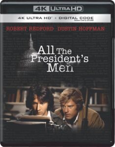 Also new from Warner on 4K UHD is ALL THE PRESIDENT’S MEN (138 mins., 1976, PG; Warner), Alan J. Pakula’s hugely acclaimed chronicle of Bob Woodward & Carl Bernstein’s Watergate reportage with Robert Redford and Dustin Hoffman memorably essaying the Washington Post reporters. This 4K UHD sports yet another peerless Warner (1.85, mono) remaster with Dolby Vision HDR and a slew of extras from past releases, albeit with a couple of major omissions. On-hand are new featurettes with CNN personnel Jake Tapper and Dana Bash, plus an archival, half-hour Making Of retrospective offering interviews with the stars and Woodward and Bernstein, an additional interview with the authors, a featurette on “Deep Throat” (aka former CIA associate director Mark Felt), a vintage promo featurette, the trailer, a Digital HD code, and a seven-minute excerpt from “Dinah!” with the host interviewing Jason Robards. Absent is a two-hour doc on the movie produced since its 2011 Blu-Ray along with Redford’s commentary from the latter.