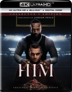 HIM 4K UHD/Blu-Ray (97 mins., 2025, R; Universal): Disappointing, violent supernatural thriller about a college football star hoping to become the next pro prospect. Under the training of his childhood idol (Marlon Wayans), young “Cameron Cade” (Trqie Withers) is able to do just that, but there’s a price to be paid for his sudden rise to football prosperity. Jordan Peele produced Justin Topping’s film, based on a reportedly well-received script by Skip Bronkie and Zack Akers which ends up being told with too heavy a hand in Tipping’s picture. This unappealing brew met with few takers at the box-office and is being fast-tracked to home video by Universal, with their 4K UHD (2.39, Dolby Atmos, Dolby Vision HDR) sporting an alternate ending, a deleted end credits scene, Blu-Ray and Digital HD code.
